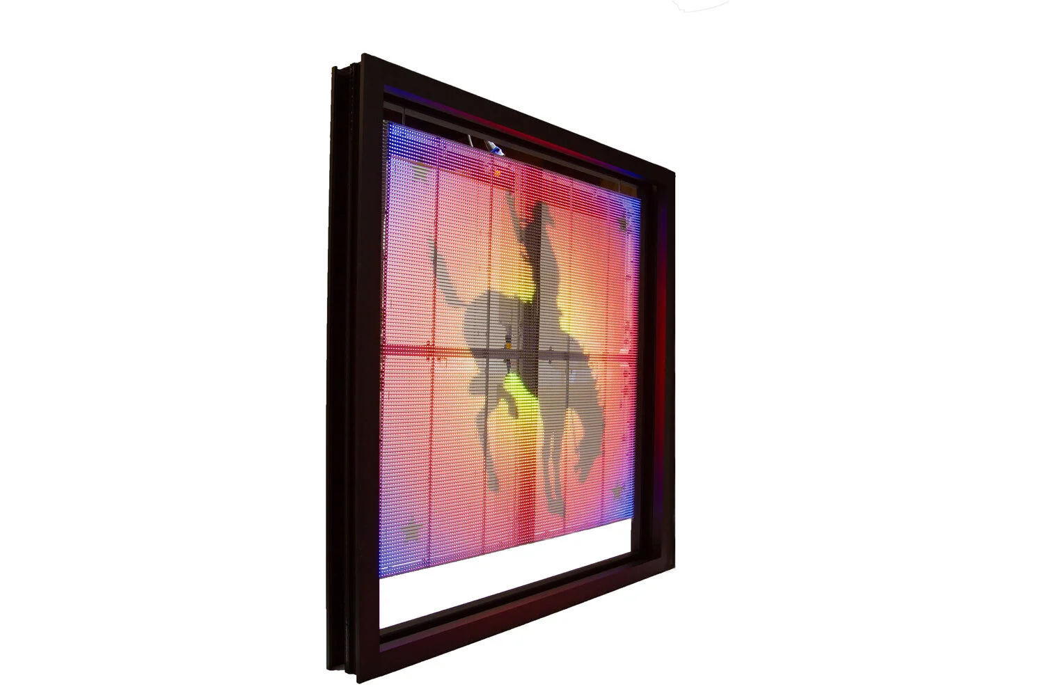 The Transparent Series LED is designed so that it allows >80% transparency when looking from the inside of the window out. The screens can be architecturally incorporated and are used for advertising and public communication.